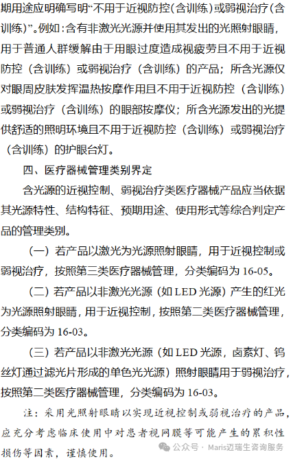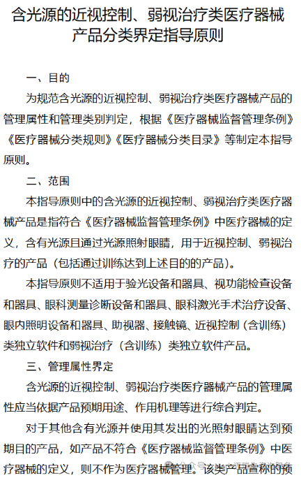 为进一步加强含光源的近视控制、弱视治疗类医疗器械产品监督管理,推动产业高质量发展,国家药监局组织制定了《含光源的近视控制、弱视治疗类医疗器械产品分类界定指导原则》(以下简称指导原则),现予发布,自发布之日起施行。申请人应当按照指导原则确定含光源的近视控制、弱视治疗类医疗器械产品管理属性和管理类别。 特此通告。
